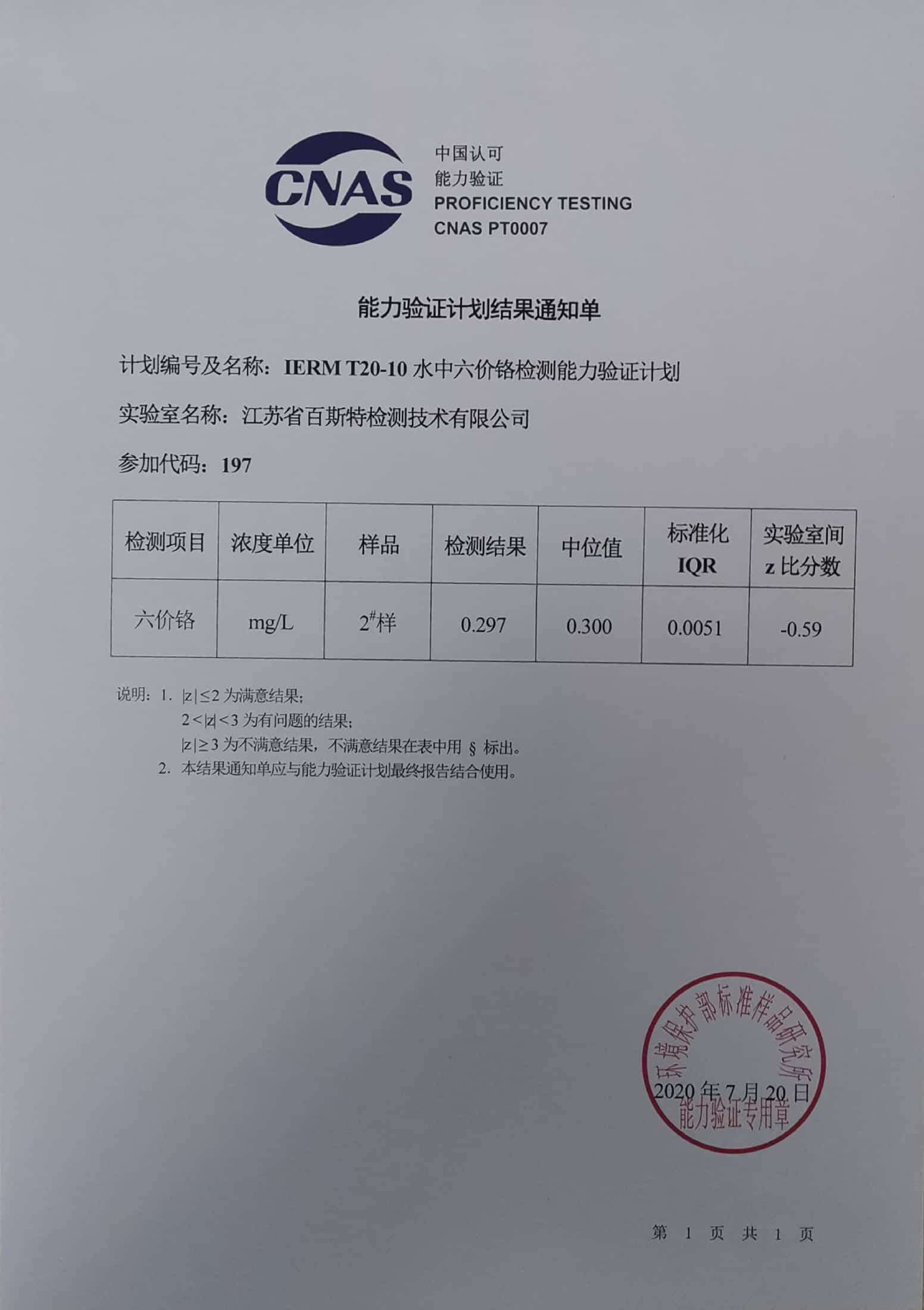 2020年能力驗證結(jié)果通知——水中六價鉻結(jié)果通知單